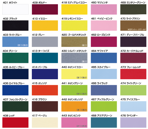 | ※実際の色は異なる場合がございます。 ※生産ロットにより、多少色が異なる場合もございます。 (注1)重ね貼りは、403ライトブルー、420・430メタリック系、440−443ネオン系を除く通常色の上にのみ可能。 可能な色でも諸条件により、仕上がりが異なります。必ずプレス後、洗濯テストをしてから本作業に入って下さい。 |